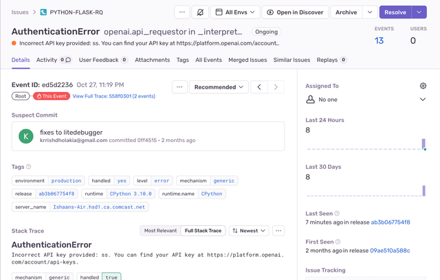 Sentry provides error monitoring for production. LiteLLM can add breadcrumbs and send exceptions to Sentry with this integration